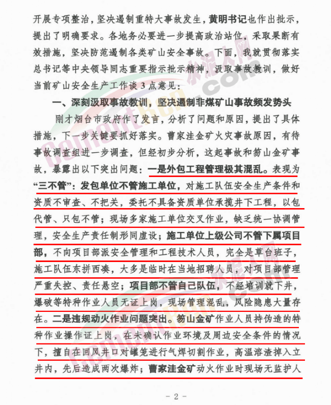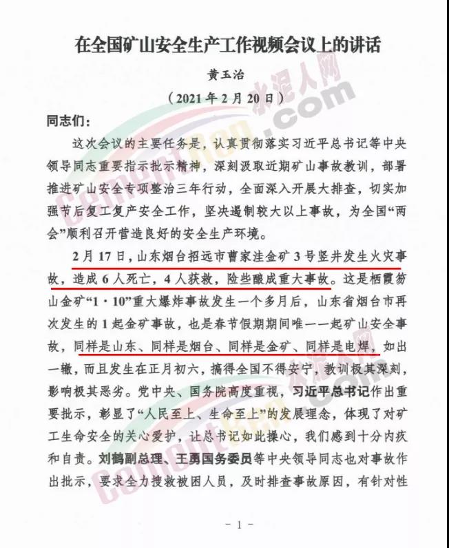 水泥人網(wǎng)通訊員消息,近日,應(yīng)急管理部副部長(zhǎng)、國(guó)家礦山安監(jiān)局局長(zhǎng)黃玉治在全國(guó)礦山安全生產(chǎn)工作視頻會(huì)議上發(fā)表講話(huà)時(shí)提到,2月17日,山東煙臺(tái)招遠(yuǎn)市曹家洼金礦3號(hào)豎井發(fā)生火災(zāi)事故,造成6人死亡,4人獲救,險(xiǎn)些釀成重大事故。這是繼棲霞笏山金礦“1?10”重大爆炸事故發(fā)生一個(gè)多月后,山東省再次發(fā)生的1起金礦事故,也是春節(jié)假期期間唯一一起礦山安全事故,同樣是山東、同樣是煙臺(tái)、同樣是金礦、同樣是電焊,如出一轍,而且發(fā)生在正月初六,搞得全國(guó)不得安寧,教訓(xùn)極其深刻,影響極其惡劣。