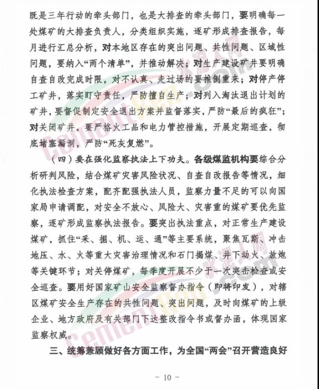 要全面深入開(kāi)展煤礦安全生產(chǎn)大排查,深刻認(rèn)識(shí)其重要性和緊迫性,在強(qiáng)化自查自改、企業(yè)內(nèi)部檢查、監(jiān)管排查、監(jiān)察執(zhí)法上下功夫,確保取得實(shí)實(shí)在在的成效。要統(tǒng)籌兼顧做好各方面工作,著力轉(zhuǎn)變思想觀念,錘煉隊(duì)伍過(guò)硬作風(fēng),嚴(yán)把節(jié)后復(fù)工復(fù)產(chǎn)安全關(guān),為全年工作起好步、開(kāi)好局。