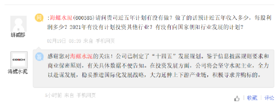 海螺水泥上市公司回復(fù)稱,公司已制定了“十四五”發(fā)展規(guī)劃。鑒于信息披露規(guī)則要求和商業(yè)保密原則,有關(guān)具體數(shù)據(jù)不便告知。在投資發(fā)展方面,公司將會(huì)堅(jiān)守水泥主業(yè),全力以赴謀發(fā)展,穩(wěn)妥推進(jìn)國(guó)際化發(fā)展戰(zhàn)略,大力延伸上下游產(chǎn)業(yè)鏈,積極尋求并購(gòu)標(biāo)的。