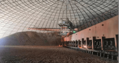 新金峰公司有2條日產(chǎn)4500噸水泥生產(chǎn)線,分別為A線和B線,每條生產(chǎn)線設(shè)有獨立的均化庫(運用堆取料技術(shù)實現(xiàn)原料的初步均化,兼具貯存與均化功能),每座均化庫有一臺圓形堆取料機(以下簡稱堆取料機),為石灰石堆料和取料一體機。上部為回轉(zhuǎn)懸臂式堆料機(以下簡稱堆料機),用于石灰石分層堆料(使不同碳酸鈣含量的石灰石分布均勻),下部為橋式刮板取料機(以下簡稱取料機),用于均化后石灰石取料。(如圖一)