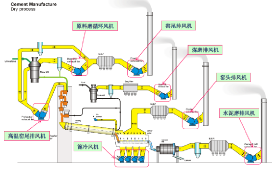 在水泥生產(chǎn)線中,風機是水泥廠的第二大功率消耗設(shè)備群, 一條中等規(guī)模的水泥生產(chǎn)線,僅大型風機就有7-10臺,小型風機百余臺。