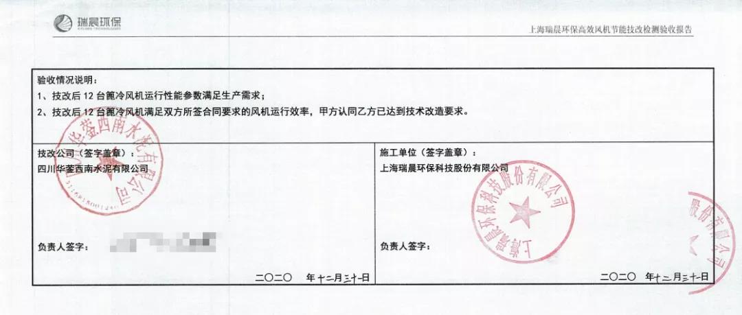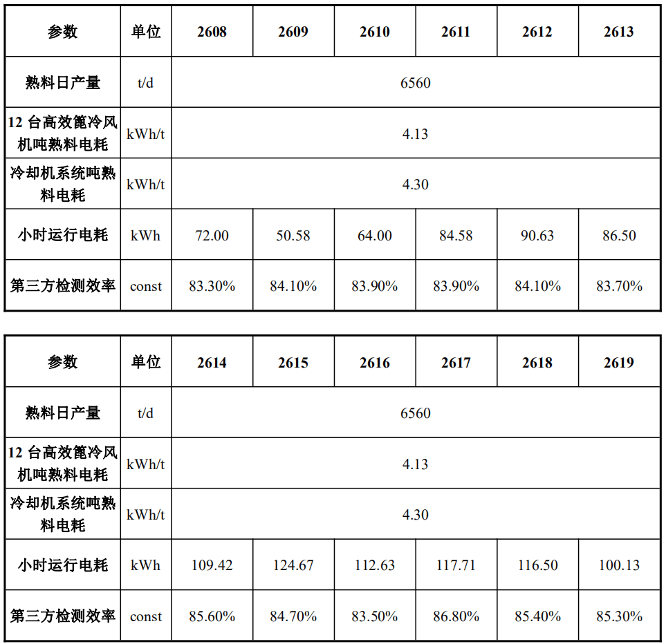 經(jīng)瑞晨環(huán)保改造后,華鎣西南12臺高效篦冷風機2608-2619運行穩(wěn)定,經(jīng)第三方(綿陽旗諾)檢測,運行效率分別高達83.30%、84.10%、83.90%、83.90%、84.10%、83.70%、85.60%、84.70%、83.50%、86.80%、85.40%、85.30%,并在熟料提產(chǎn)至6560t/d后12臺高效篦冷風機噸熟料電耗降低至4.13kWh/t,篦冷機系統(tǒng)噸熟料電耗降低至4.30kWh/t,滿足技術(shù)合同約定的篦冷機系統(tǒng)噸熟料電耗≤4.73kWh/t。瑞晨環(huán)保高效篦冷風機配合成都院配套IKN第四代篦冷床的升級換代項目完美驗收,瑞晨環(huán)保高效篦冷風機得到成都院與四川華鎣西南水泥有限公司各層領(lǐng)導以及西南水泥高層的高度認可與一致好評。