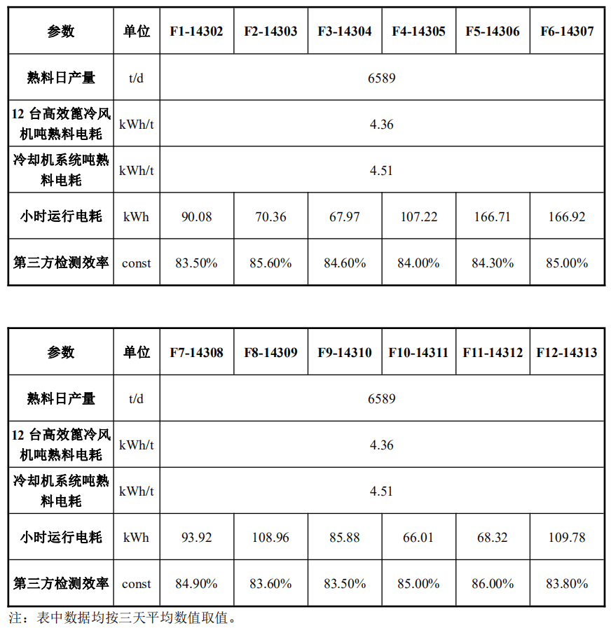 經(jīng)瑞晨環(huán)保改造后,四川國大12臺高效篦冷風機F1-14302~F12-14313運行穩(wěn)定,經(jīng)過第三方(綿陽旗諾)標定,運行效率分別高達83.50%、85.60%、84.60%、84.00%、84.30%、85.00%、84.90%、83.60%、83.50%、85.00%、86.00%、83.80%。熟料提產(chǎn)至6589t/d后,12臺高效篦冷風機噸熟料電耗降低至4.36kWh/t,篦冷機系統(tǒng)熟料電耗降低至4.51kWh/t滿足技術(shù)合同約定的噸熟料電耗≤4.93kWh/t。