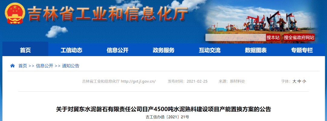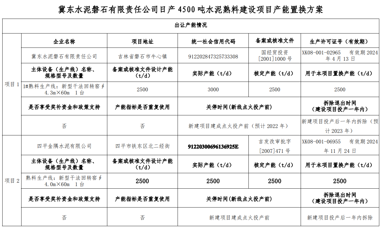 據(jù)水泥人網(wǎng)了解,2月25日吉林省工業(yè)和信息化廳日前發(fā)布《關(guān)于對冀東水泥磐石有限責(zé)任公司日產(chǎn)4500噸水泥熟料建設(shè)項目產(chǎn)能置換方案的公告》。公告內(nèi)容為冀東水泥磐石有限責(zé)任公司、四平金隅水泥有限公司各出讓一條2500t/d生產(chǎn)線,用于冀東水泥磐石有限責(zé)任公司建設(shè)一條4500噸新型干法水泥熟料生產(chǎn)線,置換比例分別為1:1和1.25:1。