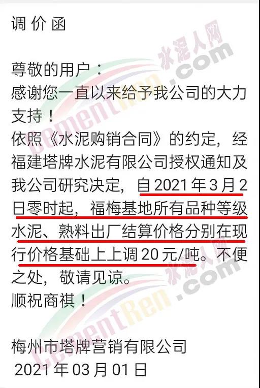 根據(jù)市場情況,經(jīng)研究,決定從2021年3月1日零時起,本公司發(fā)往福建省內(nèi)各品種各規(guī)格型號水泥在原價格基礎(chǔ)上上調(diào)20元/噸。