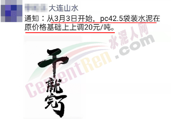 日前,大連山水銷售經(jīng)理通知從3月3日起PC42.5袋裝水泥在原價(jià)格基礎(chǔ)上上調(diào)20元/噸。