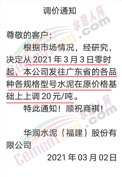 根據(jù)目前市場情況,經(jīng)公司研究,決定從2021年3月2日零時(shí)起,本公司發(fā)往廣東省內(nèi)各品種各規(guī)格型號(hào)水泥、熟料在原價(jià)格基礎(chǔ)上上調(diào)20元/噸。