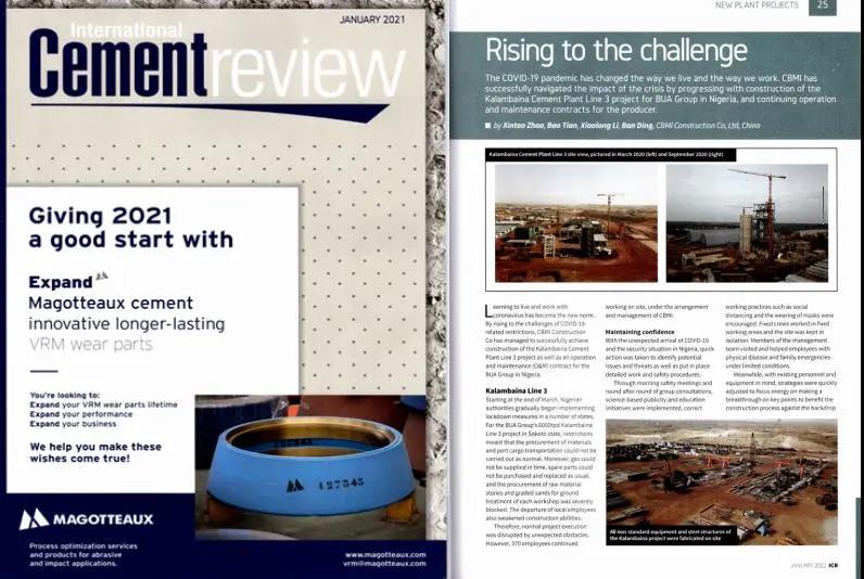 國際水泥評論- International Cement Review雜志是世界水泥業(yè)界的權(quán)威期刊。文章指出,在全球疫情肆虐,海外環(huán)境復(fù)雜艱難的背景之下,中材建設(shè)尼日利亞在建項(xiàng)目SOKOTO3線不辱使命,出色完成了各項(xiàng)工作,贏得了業(yè)主的高度信任;生產(chǎn)運(yùn)營項(xiàng)目EDO兩條6000T/D生產(chǎn)線和SOKOTO一條3300T/D生產(chǎn)線,維穩(wěn)保產(chǎn),運(yùn)營成績再創(chuàng)新高。