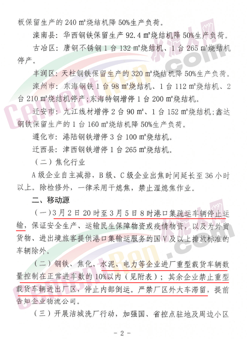鋼鐵、焦化、水泥、電力等企業(yè)進廠重型載貨車輛數(shù)量控制在正常進車數(shù)的10%以內(nèi)(見附表);其余企業(yè)禁止重型載貨車輛進出廠區(qū),停止內(nèi)部倒運。嚴禁廠區(qū)外大車滯留,提前告知企業(yè)物流公司。
