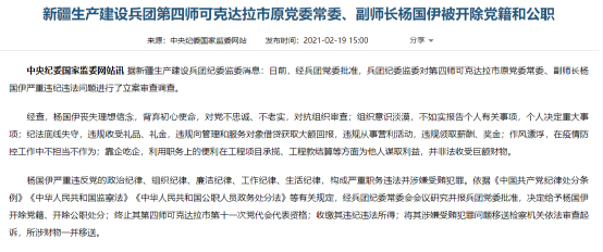 2月19日,中央紀(jì)委國家監(jiān)委網(wǎng)站發(fā)布要聞消息《新疆生產(chǎn)建設(shè)兵團(tuán)第四師可克達(dá)拉市原黨委常委、副師長楊國伊被開除黨籍和公職》。
