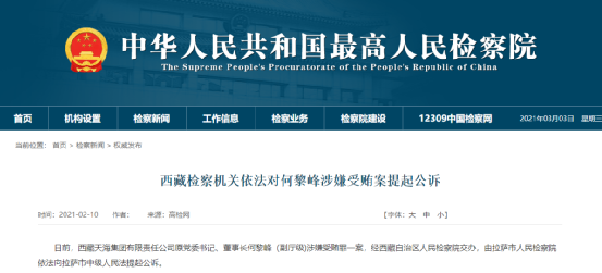 2021年2月10日,最高人民檢察院官網(wǎng)發(fā)布消息:西藏天海集團(tuán)有限責(zé)任公司原黨委書記、董事長何黎峰(副廳級(jí))涉嫌受賄罪一案,經(jīng)西藏自治區(qū)人民檢察院交辦,由拉薩市人民檢察院依法向拉薩市中級(jí)人民法提起公訴。