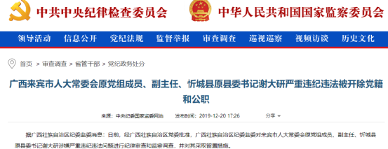 2019年12月20日,中央紀(jì)委國家監(jiān)委網(wǎng)站消息《廣西來賓市人大常委會(huì)原黨組成員、副主任、忻城縣原縣委書記謝大研嚴(yán)重違紀(jì)違法被開除黨籍和公職》。