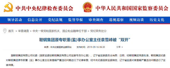 2019年9月16日,中央紀(jì)委國家監(jiān)委網(wǎng)站消息,《鞍鋼集團(tuán)原專職董(監(jiān))事辦公室主任袁雪峰被“雙開”》 。