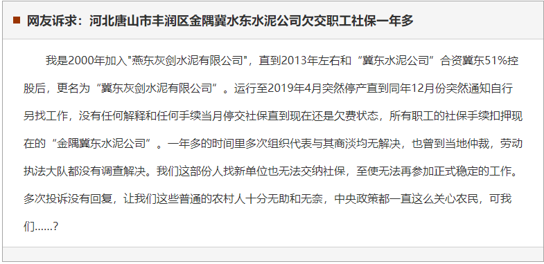 日前,有網(wǎng)友在河北新聞網(wǎng)陽光理政平臺(tái)上留言表示自己原是冀東灰劍水泥有限公司員工,后因企業(yè)停產(chǎn),要求其另行找工作,目前社保手續(xù)被扣押,無法繼續(xù)交納社保,故而求助相關(guān)部門。