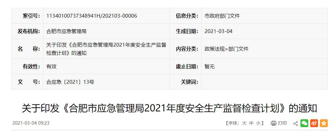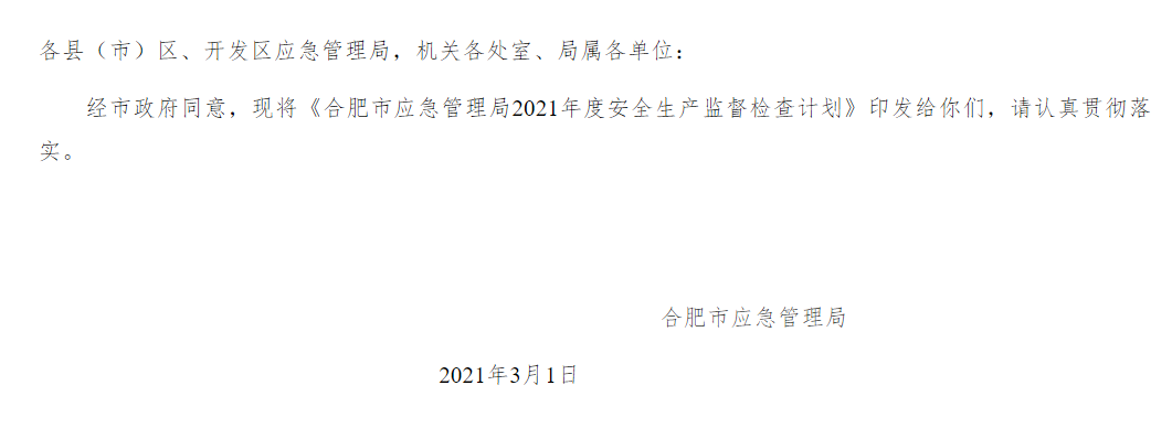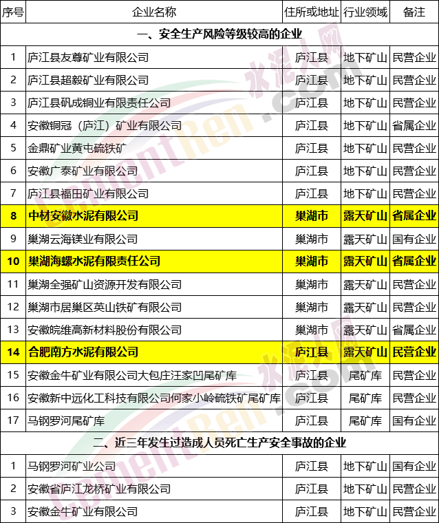 3月4日,安徽省合肥市人民政府網(wǎng)站發(fā)布《合肥市應(yīng)急管理局2021年度安全生產(chǎn)監(jiān)督檢查計(jì)劃》,將重點(diǎn)檢查20家安全生產(chǎn)風(fēng)險(xiǎn)等級較高的非煤礦山企業(yè)(10家地下礦山、7家露天礦山和3家尾礦庫)。其中包括中材安徽水泥有限公司、巢湖海螺水泥有限責(zé)任公司、合肥南方水泥有限公司等企業(yè)的露天礦山。