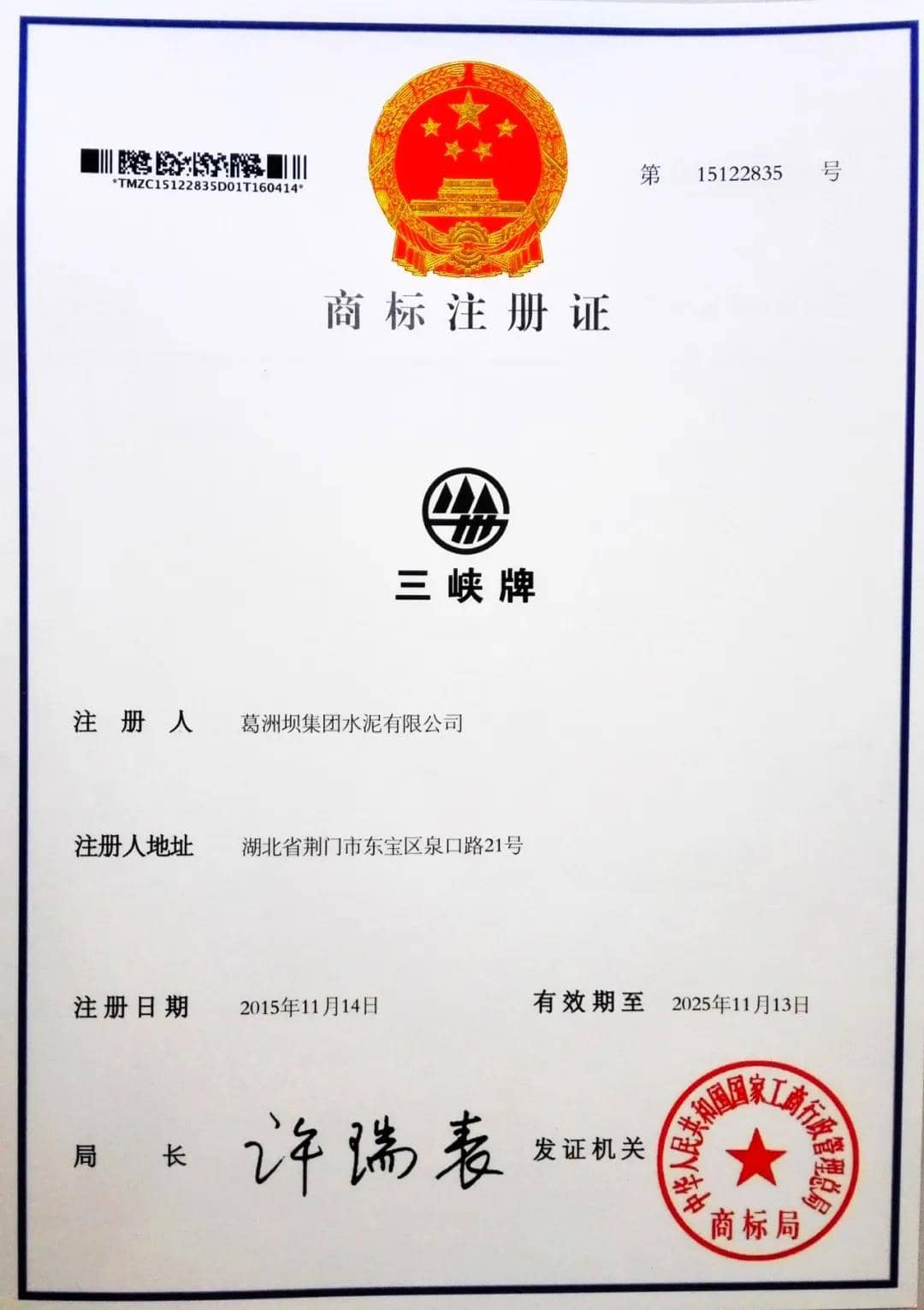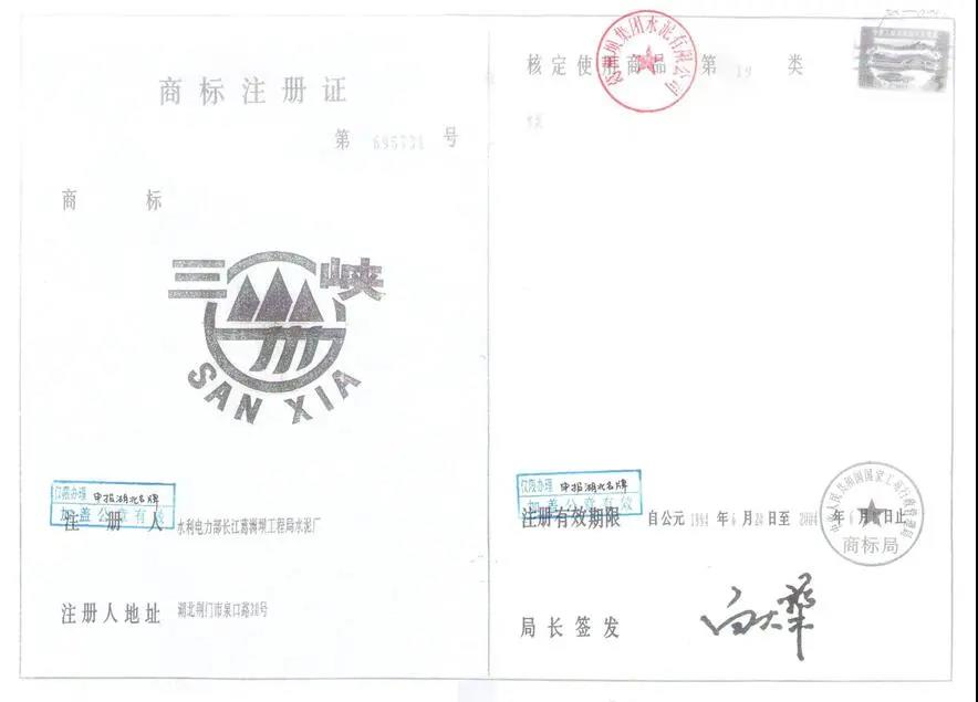 新版“三峽牌”商標及商標注冊證書