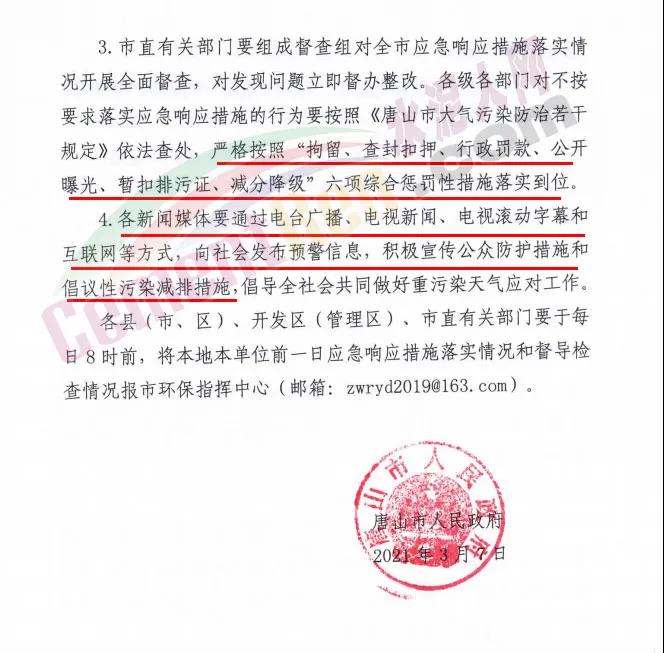 3.市直有關(guān)部門要組成督查組對(duì)全市應(yīng)急響應(yīng)措施落實(shí)情況開展全面督查,對(duì)發(fā)現(xiàn)問題立即督辦整改。各級(jí)各部門對(duì)不按要求落實(shí)應(yīng)急響應(yīng)措施的行為要按照《唐山市大氣污染防治若干規(guī)定》依法查處,嚴(yán)格按照“拘留、查封扣押、行政罰款、公開曝光、暫扣排污證、減分降級(jí)”六項(xiàng)綜合懲罰性措施落實(shí)到位。