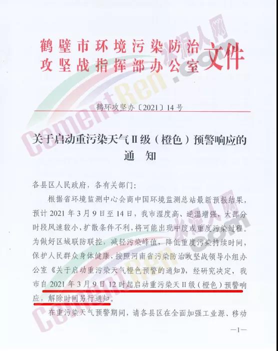 鶴壁市環(huán)境污染防治攻堅戰(zhàn)指揮部辦公室發(fā)布《關(guān)于啟動重污染天氣Ⅱ級(橙色)預警響應的通知》自2021年3月9日12時起啟動重污染天Ⅱ級(橙色)預警響應,解除時間另行通知。在重污染天氣預警期間,請各縣區(qū)在全面加強工業(yè)源、移動源、揚塵源污染管控,嚴格落實水泥和磚瓦窯企業(yè)錯峰生產(chǎn)要求的同時,鼓勵涉大宗物料運輸企業(yè)在確保安全生產(chǎn)的前提下,停止公路運輸。重型貨車及非道路移動機械停運管理、施工工地停工情況的督查力度。