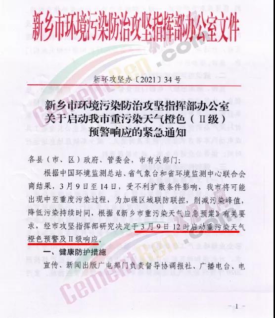 新鄉(xiāng)市環(huán)境污染防治攻堅指揮部辦公室發(fā)布《關(guān)于啟動新鄉(xiāng)市重污染天氣橙色(Ⅱ級)預警響應的緊急通知》稱于3月9日12時啟動重污染天氣橙色預警及Ⅱ級響應。