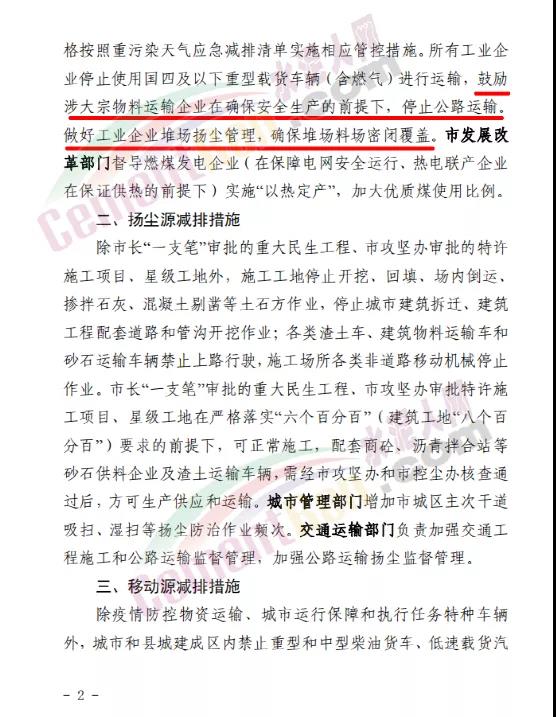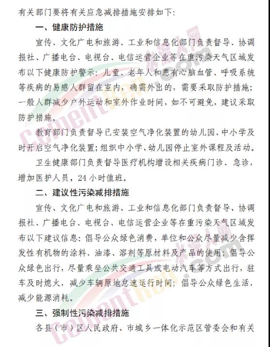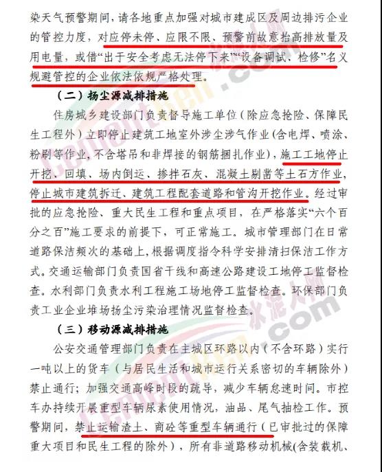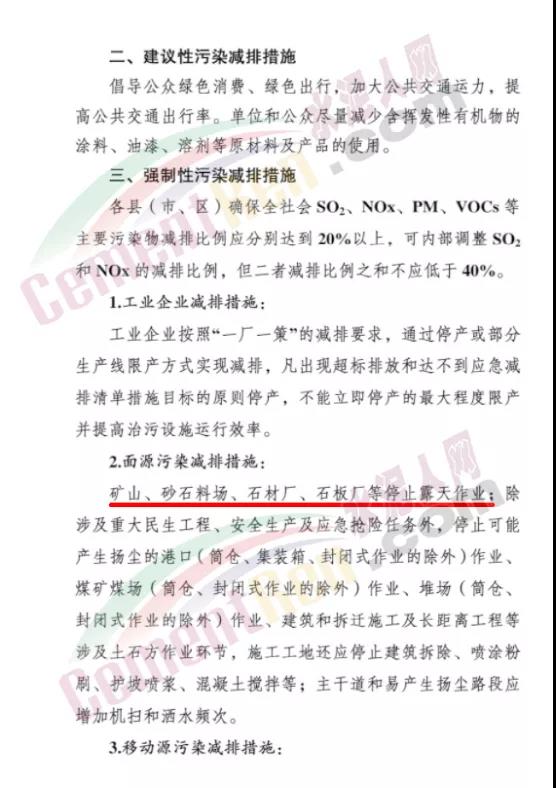 工業(yè)企業(yè)減排措施方面∶落實重污染天氣應急預案、應急減排清單確定的減排措施。揚塵污染減排措施方面∶礦山、砂石料場、石材廠、石板廠等停止露天作業(yè);施工工地禁止土石方作業(yè)、建筑拆除、噴涂粉刷、護坡噴漿、混凝土攪拌等;