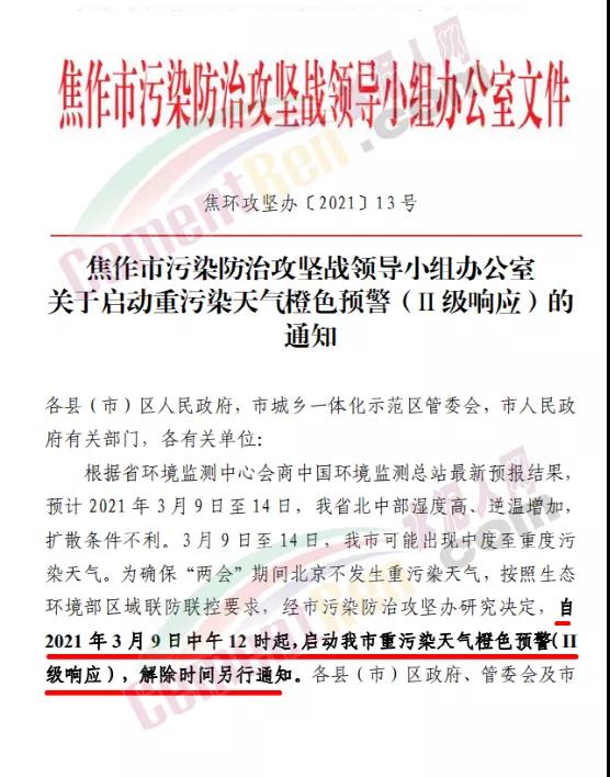 焦件市污染防治攻堅戰(zhàn)領(lǐng)導小組辦公室文件發(fā)布《焦作市污染防治攻堅戰(zhàn)領(lǐng)導小組辦公室關(guān)于啟動重污染天氣橙色預警(Ⅱ級響應)的通知》稱自2021年3月9日中午12時起,啟動焦作市重污染天氣橙色預警(Ⅱ級響應),解除時間另行通知。