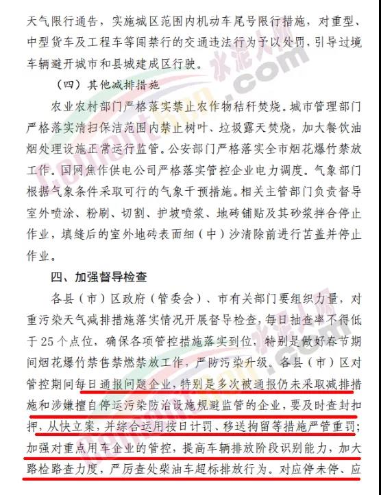 鋼鐵、水泥、焦化、破碎加工、物流園區(qū)等涉及到大宗物料運輸?shù)钠髽I(yè)在確保安全生產(chǎn)的前提下,停止公路運輸。重污染天氣預警期間,各縣(市、區(qū))、市直有關(guān)部門要重點加強對建成區(qū)及周邊排污企業(yè)的管控力度,對應停未停、應限不限的企業(yè)依法依規(guī)嚴格處理。