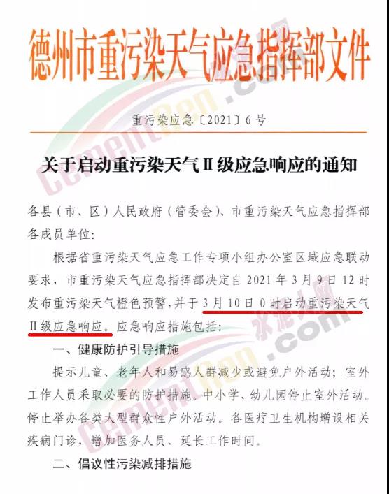 山東德州市重污染天氣應急指揮部發(fā)布《關(guān)于啟動重污染天氣Ⅱ級應急響應的通知》要求自3月10日0時啟動重污染天氣Ⅱ級應急響應。