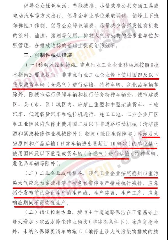 工業(yè)企業(yè)減排措施。涉氣工業(yè)企業(yè)按照德州市重污染天氣應急預案減排清單橙色預警停限產(chǎn)措施執(zhí)行減排。應急指令發(fā)布前已停止生產(chǎn)的生產(chǎn)線、生產(chǎn)裝置、生產(chǎn)工序,應急響應期間不得恢復生產(chǎn)。