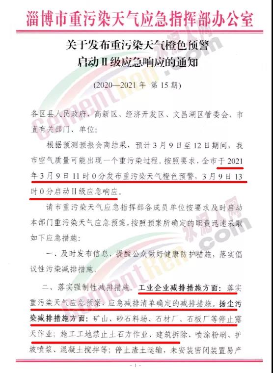 淄博市重污染天氣應急指揮部辦公室發(fā)布《關(guān)于發(fā)布重污染天氣橙色預警啟動Ⅱ級應急響應的通知》稱按照要求,全市于2021年3月9日11時0分發(fā)布重污染天氣橙色預警,3月9日13時0分啟動Ⅱ級應急響應。請市重污染天氣應急指揮部各成員單位按要求及時啟動本部門重污染天氣應急預案,按照預案所確定的職責迅速采取如下應急措施∶