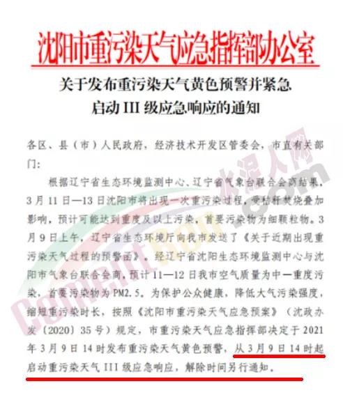 根據(jù)遼寧省生態(tài)環(huán)境廳《關(guān)于近期出現(xiàn)重污染天氣過程的預警函》提示,經(jīng)遼寧省生態(tài)環(huán)境監(jiān)測中心、遼寧省氣象臺聯(lián)合會商,2021年3月11日-13日大氣擴散條件較為不利,受秸稈焚燒疊加影響,預計我市將出現(xiàn)一次重污染過程。經(jīng)遼寧省沈陽生態(tài)環(huán)境監(jiān)測中心與沈陽市氣象臺聯(lián)合會商,預計11—12日我市空氣質(zhì)量為中—重度污染,首要污染物為PM2.5。為了做好重污染天氣應對工作,保障公眾健康,按照《沈陽市重污染天氣應急預案》(沈政辦發(fā)〔2020〕35號)規(guī)定,市重污染天氣應急指揮部決定于3月9日14時發(fā)布重污染天氣黃色預警,并于14時緊急啟動Ⅲ級應急響應。