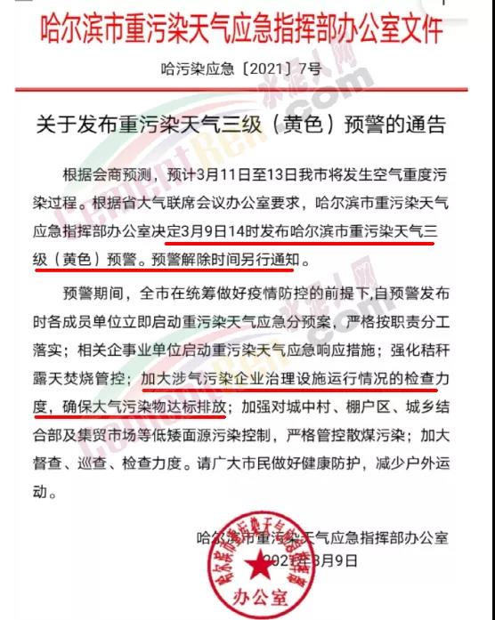 根據(jù)《哈爾濱市重污染天氣應急預案(2020年修訂)》規(guī)定,哈爾濱市重污染天氣應急指揮部辦公室決定3月9日14時發(fā)布哈爾濱市重污染天氣三級(黃色)預警。