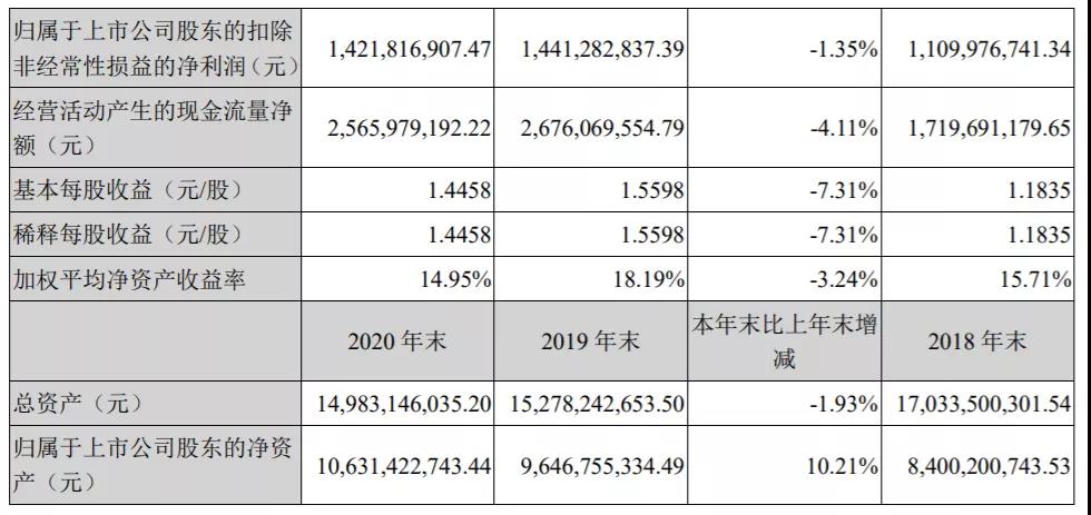 天山股份公司于2021年03月12日發(fā)布年報,報告期內(nèi),公司實現(xiàn)營業(yè)收入86.92億元,同比下降10.28%,實現(xiàn)凈利潤15.16億元,同比下降7.31%,加權(quán)平均凈資產(chǎn)收益率14.26%,基本每股收益1.4458元/股,總資產(chǎn)149.83億元,總負債36.64億元,資產(chǎn)負債率24.45%,現(xiàn)金流凈額為9.12億元,現(xiàn)金流凈增加額為3.06億元。