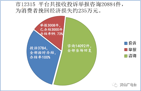 2020年,黃山市12315 平臺共接收投訴舉報咨詢20884件,為消費者挽回損失235萬元。