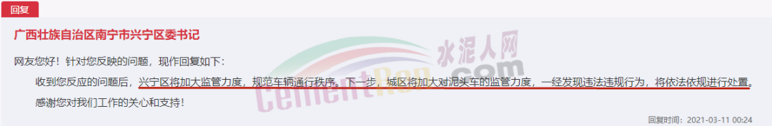 2021年3月11日廣西壯族自治區(qū)南寧市興寧區(qū)委書記回應(yīng)稱興寧區(qū)將加大監(jiān)管力度,規(guī)范車輛通行秩序。下一步,城區(qū)將加大對泥頭車的監(jiān)管力度,一經(jīng)發(fā)現(xiàn)違法違規(guī)行為,將依法依規(guī)進(jìn)行處置。