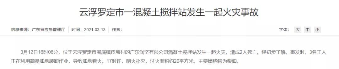 廣東省應(yīng)急管理廳消息,3月12日16時(shí)06分,位于廣東省云浮羅定市圍底鎮(zhèn)宦塘村的廣東潤(rùn)堅(jiān)有限公司混凝土攪拌站發(fā)生一起火災(zāi),造成2人死亡。經(jīng)初步了解,事發(fā)時(shí),3名工人正在利用簡(jiǎn)易油泵裝卸作業(yè),導(dǎo)致油泵著火。17時(shí)許,明火撲滅,過火面積約20平方米,主要燃燒物為柴油。