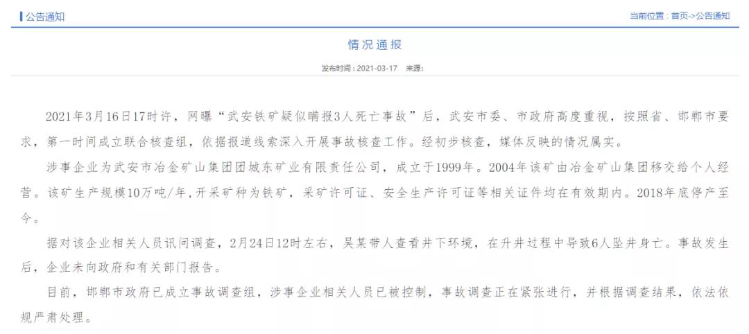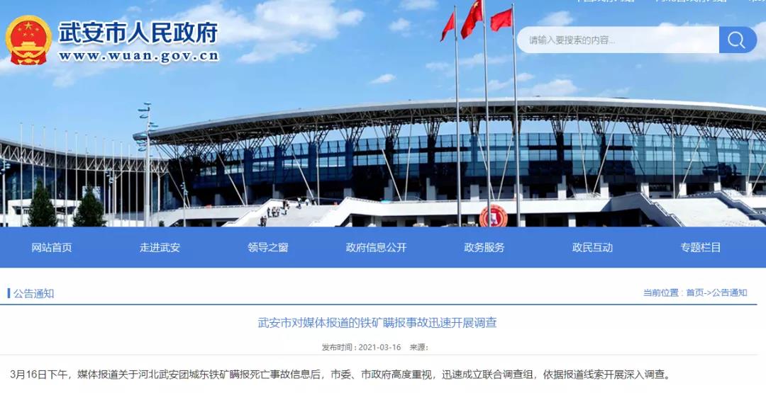 據(jù)武安市人民政府網(wǎng)站17日消息,2021年3月16日17時(shí)許,網(wǎng)曝“武安鐵礦疑似瞞報(bào)3人死亡事故”后,武安市委、市政府高度重視,按照省、邯鄲市要求,第一時(shí)間成立聯(lián)合核查組,依據(jù)報(bào)道線索深入開展事故核查工作。經(jīng)初步核查,媒體反映的情況屬實(shí)。