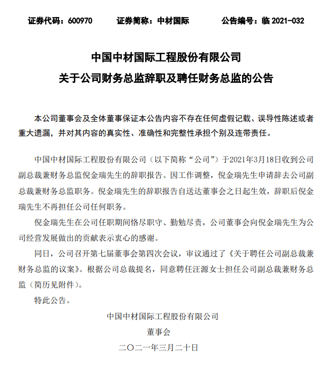 根據(jù)公告,公司于2021年3月18日收到公司副總裁兼財(cái)務(wù)總監(jiān)倪金瑞的辭職報(bào)告。因工作調(diào)整,倪金瑞申請(qǐng)辭去公司副總裁兼財(cái)務(wù)總監(jiān)職務(wù)。倪金瑞的辭職報(bào)告自送達(dá)董事會(huì)之日起生效,辭職后倪金瑞不再擔(dān)任公司任何職務(wù)。