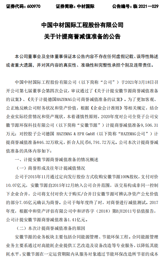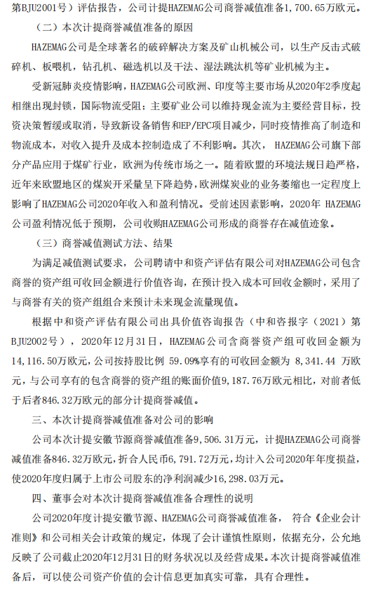 公司同期公告,公司對(duì)全資子公司安徽節(jié)源環(huán)??萍加邢薰?“安徽節(jié)源”)計(jì)提商譽(yù)減值準(zhǔn)備9506.31萬元,對(duì)控股子公司德國HAZEMAG EPR GmbH(“HAZEMAG公司”)計(jì)提商譽(yù)減值準(zhǔn)備846.32萬歐元,折合人民幣6791.72萬元,均計(jì)入公司2020年年度損益,使2020年度歸屬于上市公司股東的凈利潤減少1.63億元。
