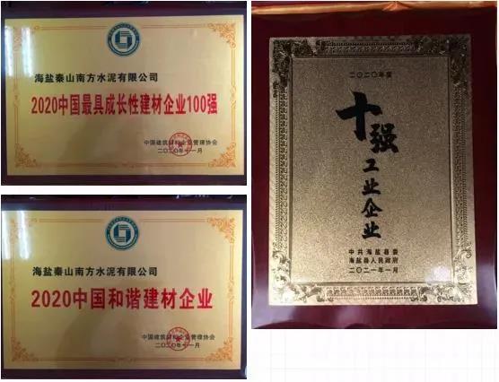 海鹽秦山南方水泥有限公司曾先后獲得海鹽工業(yè)十強企業(yè)、工業(yè)納稅三十強企業(yè)、中國最具成長性建材企業(yè)和中國和諧建材企業(yè)等榮譽。
