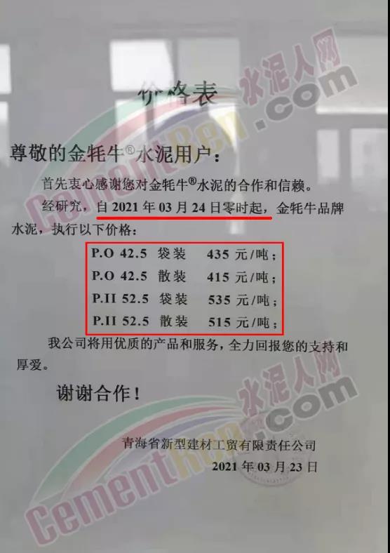 青海省新型建材工貿(mào)有限責(zé)任公司通知自3月24日零時起,金牦牛品牌水泥執(zhí)行新價格,PO42.5散裝報價415元/噸,P.II52.5散裝水泥報價515元/噸。