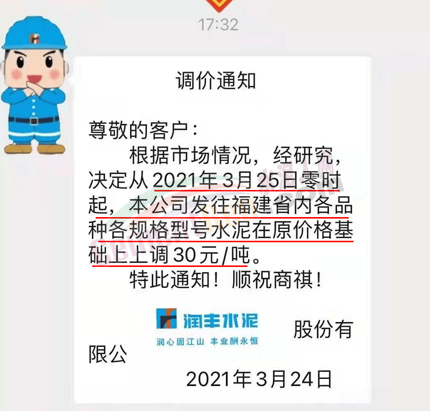 福建區(qū)域華潤水泥、金牛水泥、明獅水泥通知自即日起上調(diào)30元/噸。