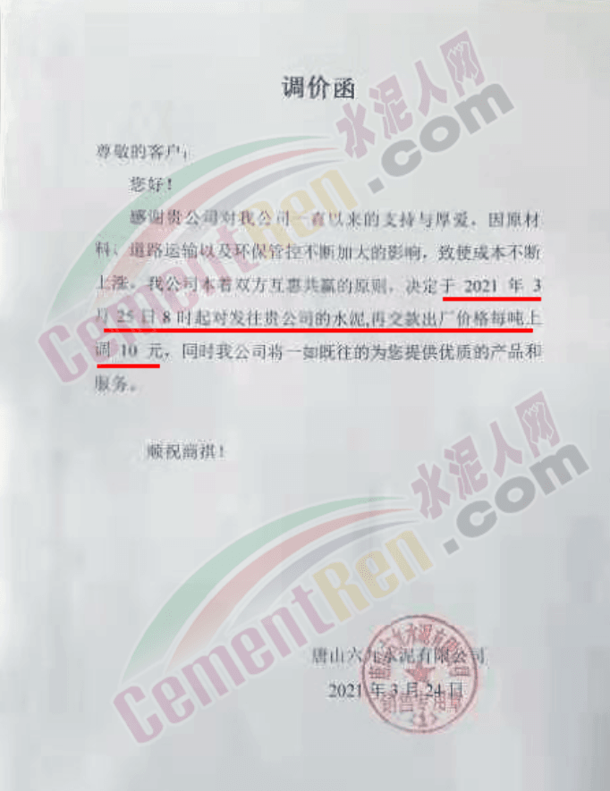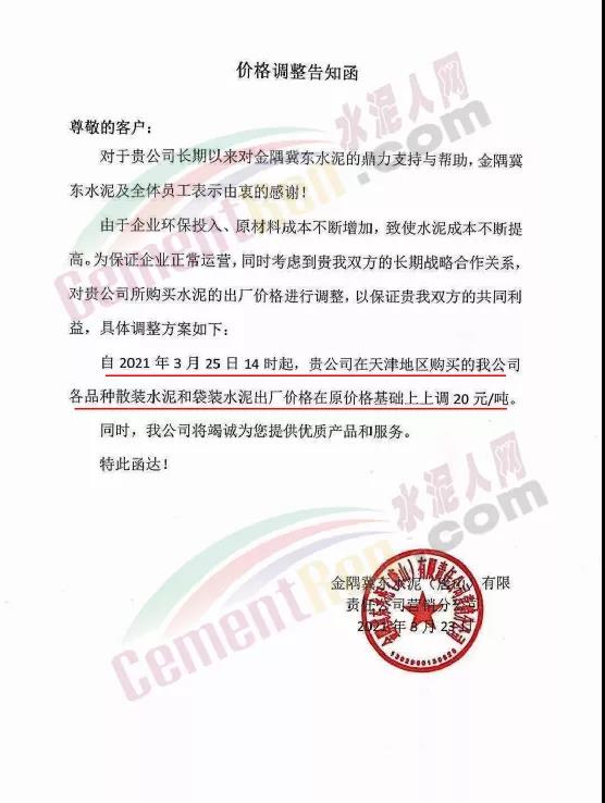 金隅冀東水泥(唐山)有限責(zé)任公司營銷分公司通知,由于企業(yè)環(huán)保投入、原材料成本不斷增加,致使水泥成本不斷提高。為保證企業(yè)正常運營,對水泥的出廠價格進行調(diào)整,自2021年3月25日14時起,天津地區(qū)各品種散裝水泥和袋裝水泥出廠價格在原價格基礎(chǔ)上上調(diào)20元/噸。