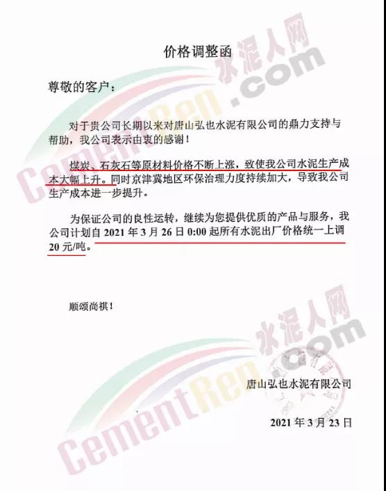 唐山弘也水泥通知因煤炭、石灰石等原材料價格不斷上漲,致使公司水泥生產(chǎn)成本大幅上升。同時京津冀地區(qū)環(huán)保治理力度持續(xù)加大,導(dǎo)致公司生產(chǎn)成本進一步提升。為保證公司的良性運轉(zhuǎn),自 2021年3月26日零點起所有水泥出廠價格統(tǒng)一上調(diào) 20元/噸。