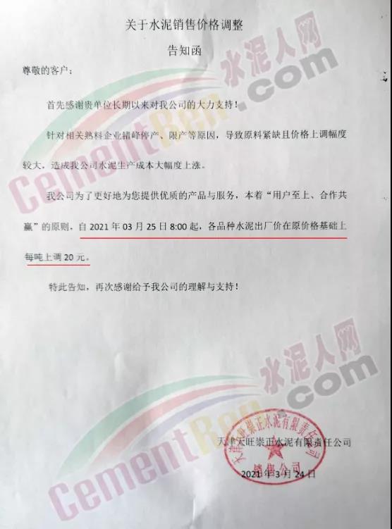 天津天旺崇正水泥有限責(zé)任公司通知自3月25日8時起,各品種水泥出廠價在原價格基礎(chǔ)上上調(diào)20元/噸。