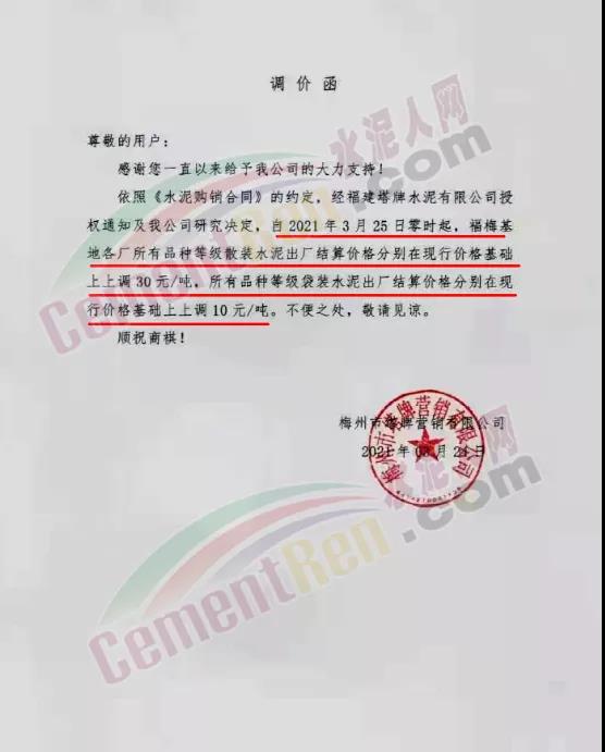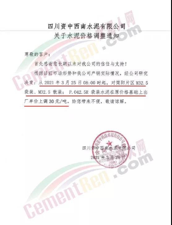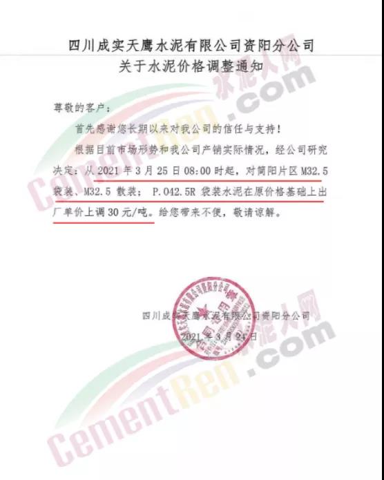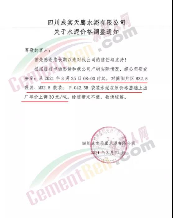 近期,因市場原因,經(jīng)研究決定,自2021年3月26日零時起,各品種散、袋水泥在原有價格基礎(chǔ)上上調(diào)30元/噸。