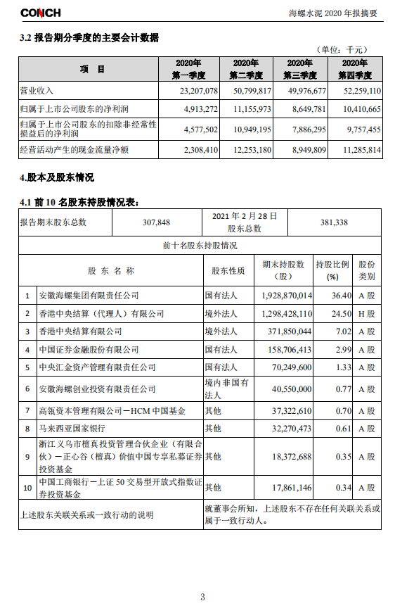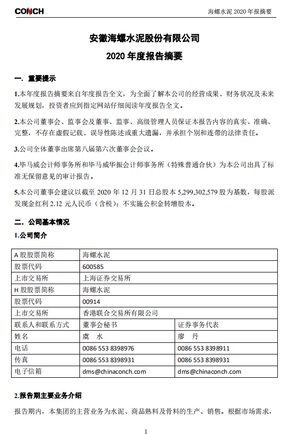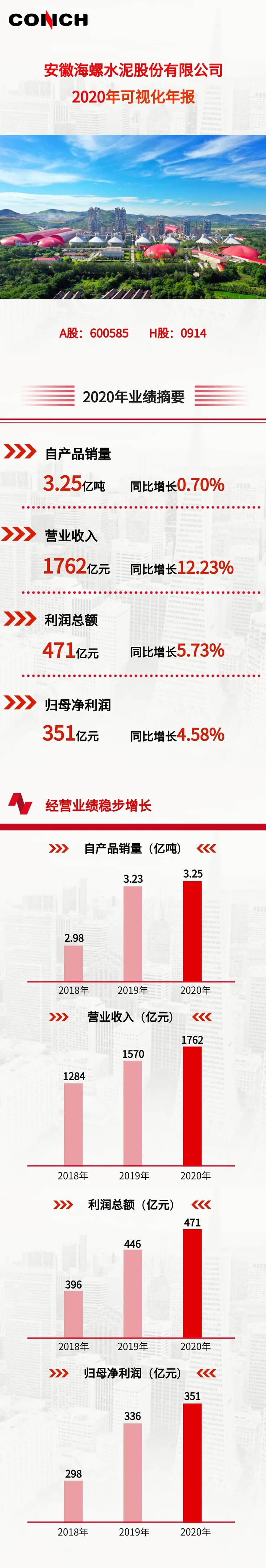 海螺水泥(600585)25日晚間發(fā)布年報(bào),2020年實(shí)現(xiàn)營(yíng)業(yè)總收入1762.43億元,同比增長(zhǎng)12.23%;歸屬母公司股東凈利潤(rùn)351.3億元,同比增長(zhǎng)4.58%;基本每股收益為6.63元。