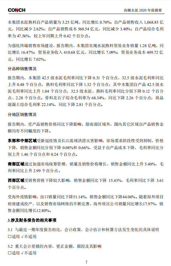 報(bào)告期內(nèi),本集團(tuán)水泥和熟料合計(jì)凈銷量為4.53億噸,同比增長(zhǎng)4.69%;實(shí)現(xiàn)主營(yíng)業(yè)務(wù)收入1,479.54億元,同比減少0.11%;營(yíng)業(yè)成本970.26億元,同比增長(zhǎng)0.74%;產(chǎn)品綜合毛利率為34.42%,較上年同期下降0.55個(gè)百分點(diǎn)。