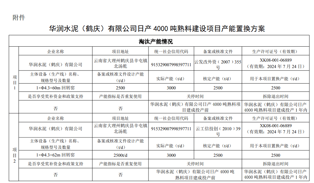 日前云南工信廳發(fā)布了一則水泥熟料生產(chǎn)線產(chǎn)能置換公示稱,華潤(rùn)水泥鶴慶公司通過退出兩條2500t/d生產(chǎn)線,在云南省大理州鶴慶縣內(nèi)新建一條4000t/d熟料生產(chǎn)線,并計(jì)劃于2024年點(diǎn)火投產(chǎn),兩條2500t/d生產(chǎn)線將于新建項(xiàng)目建成投產(chǎn)1年內(nèi)拆除退出。