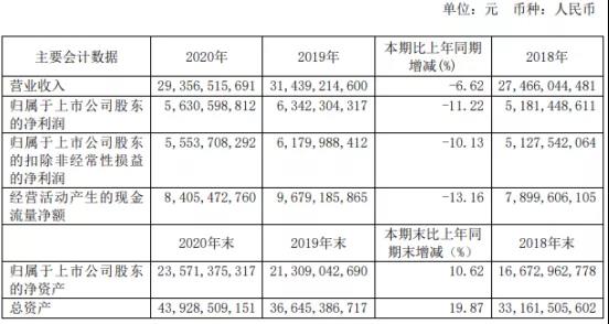 公告披露顯示經(jīng)董事會審議的報(bào)告期利潤分配預(yù)案或公積金轉(zhuǎn)增股本預(yù)案:2020年度,母公司實(shí)現(xiàn)凈利潤為3,155,313,737元,合并后歸屬于母公司股東的凈利潤為5,630,598,812元。截止2020年12月31日母公司可供分配利潤為7,370,600,800元。