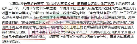 2019年七月被中國網報道禹州萇莊鄉(xiāng)磊磊石礦處于生產狀態(tài),十余輛鉤機正在山上開采,十幾輛卡車忙著裝載運輸,車輛并未覆蓋篷布,所經之處揚塵隨風而起,周圍無噴淋灑水等抑塵措施,礦渣隨意在地表堆放。